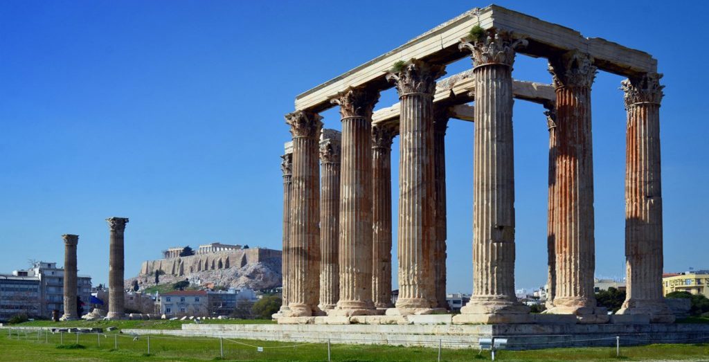 این مکان بهعنوان بزرگترین معبد در کل یونان شناخته شده است. ساخت این مجموعه عظیم باستانی درحدود ۷۰۰ سال بطول انجامیده است. بعبارتدیگر، ساخت این بنا ۵۱۵ سال پیش از میلاد مسیح بهدستور پیزسیتراتوس آغاز شده ولی بدلیل ظلم و جبر وی و پسرش متوقف شده است. دومین بار ۱۷۵سال پیش از میلاد مسیح ساخت این بنا از سرگرفته شده ولی ۱۰ سال بعد با مرگ معمار رومی کوسیتیوس نیمهکاره باقی مانده است. ۱۳۲ سال قبل از میلادمسیح و در دوره امپراظوری هاردیان ساختمان معبد پس از کشوقوسهای فراوان به اتمام رسیده و به بازیهای المپیک زئوس اهدا شده است. ارتفاع هریک از ستونها به ۱۷ متر (۵۷ پا) میرسد و هریک از آنها توسط اتاقکی احاطه شده که درون آن دو مجسمه بزرگ قرار دارد.